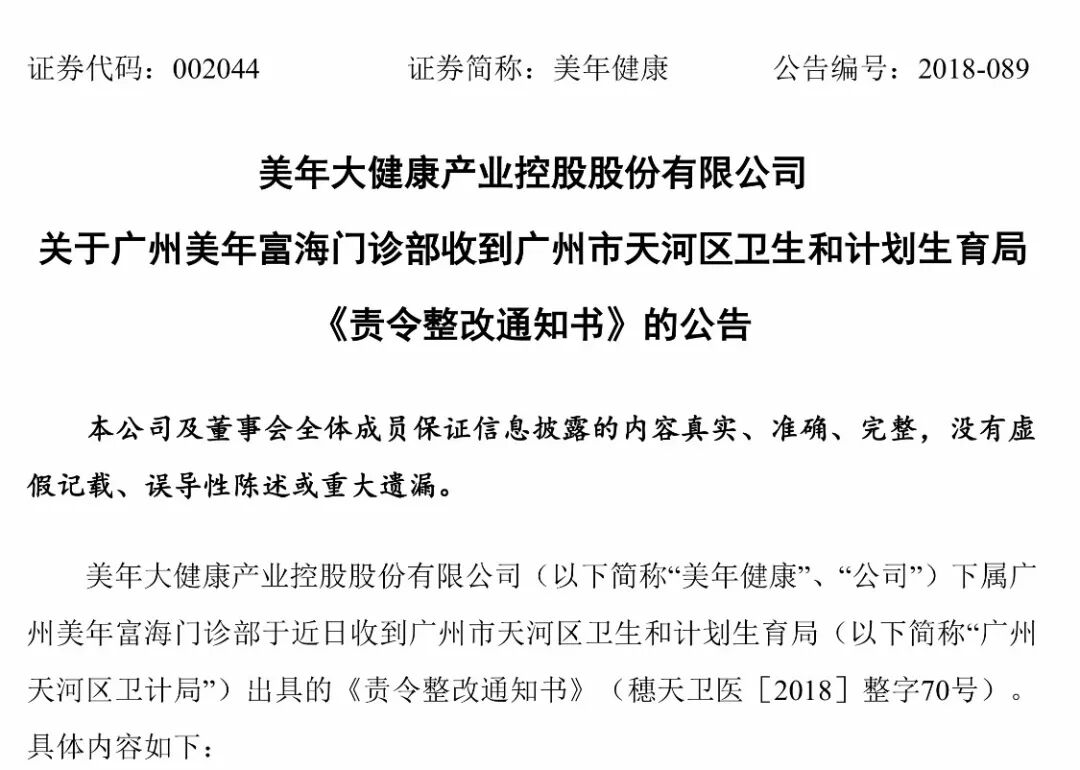 美年健康在8月5日晚的公告中表示,在收到《責(zé)令整改通知書(shū)》后,**時(shí)間派駐專項(xiàng)工作小組進(jìn)駐廣州美年富海門(mén)診部,進(jìn)行深度調(diào)查,并逐步落實(shí)整改。