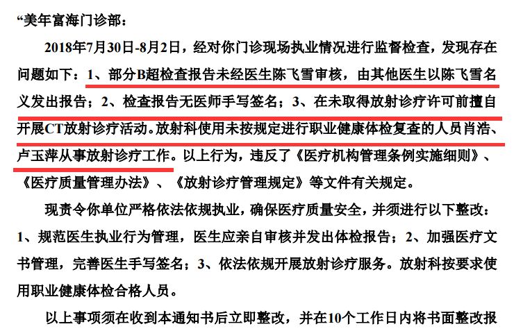 8月5日晚,美年健康發(fā)布公告,廣州美年富海門(mén)診部收到廣州市天河區(qū)衛(wèi)生和計(jì)劃生育局《責(zé)令整改通知書(shū)》,證實(shí)了美年健康美年富海門(mén)診部存在冒名醫(yī)生、體檢報(bào)告無(wú)醫(yī)師手寫(xiě)簽名、違規(guī)開(kāi)展CT放射診療活動(dòng)等三大違規(guī)行為: